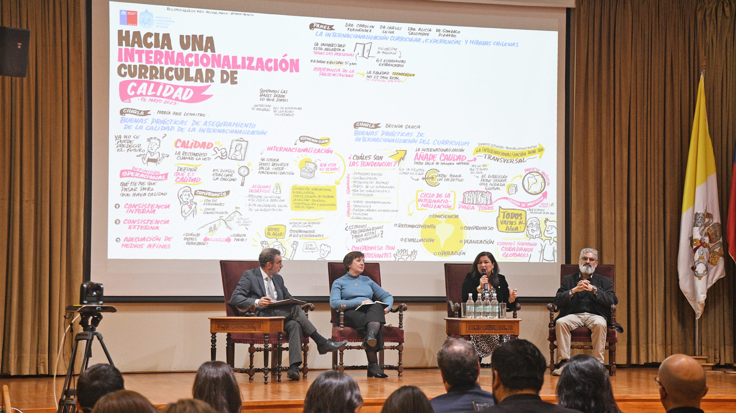 Qué es la internacionalización y cómo ésta agrega calidad a nuestro quehacer, fue el foco del seminario Internacionalización curricular: Una ruta a la calidad, actividad que se desarrolló el 16 de mayo, en el Aula Magna Manuel José Irarrázaval. El encuentro tuvo una alta convocatoria y contó con la presencia de representantes de 22 instituciones de educación superior de nuestro país y 2 extranjeras, junto a más de 500 personas que siguieron la transmisión simultánea a través del canal de Youtube de la Vicerrectoría de Asuntos Internacionales (VRAI UC).